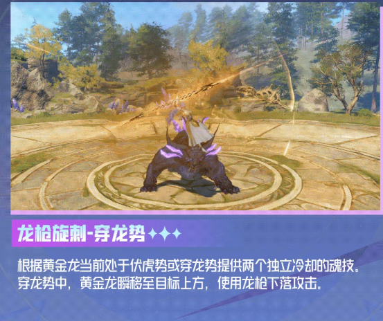 六魂环魂技「龙战于野」为无读条召唤技,全程保持角色行动自由,彻底规避连招中断风险。其实际攻击段数与【穿龙】【伏虎】层数正相关,层数越高,黄金龙发动的攻击次数越多,总伤提升显著。该设计反向强化了前期双架势轮换与层数管理的重要性,使每一层积累都直接转化为最终爆发的确定性收益。
