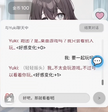 3、“一起玩”随机事件模块:点击主界面【一起玩】入口后,系统基于玩家历史交互数据与当前时间参数,动态匹配一项限时共游活动。可能包含双人合作小游戏、虚拟逛街购物、节日限定任务等,过程中可为Yuki选购服饰或饰品,单次完成即可获得可观好感度加成。所有事件组合均经算法生成,确保内容不重复、体验不固化。