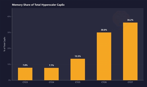 SemiAnalysis指出,内存支出占比在2027财年可能进一步攀升,表明DRAM短缺短期内不会缓解。