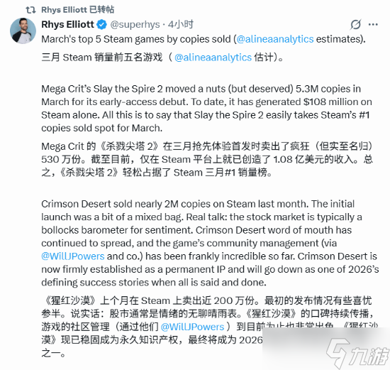 根据Alinea Analytics的数据(由分析师Rhys Elliott在社交媒体分享),游戏在3月售出约530万份。该作于3月5日上线,目前在Steam平台创造了约1.08亿美元收入。