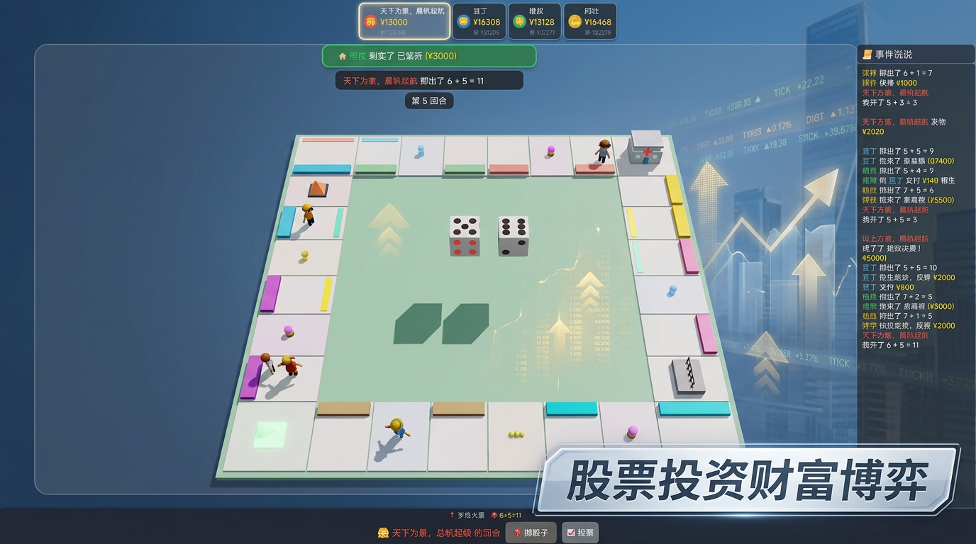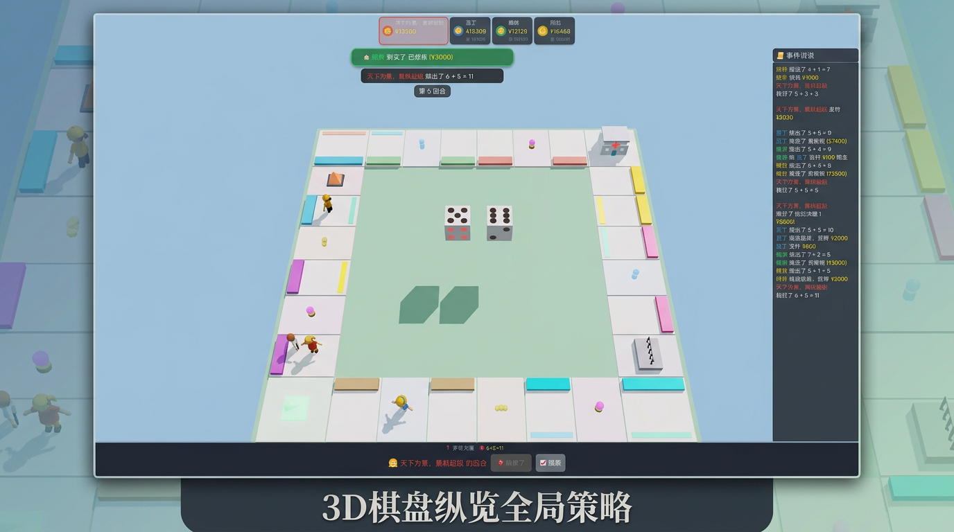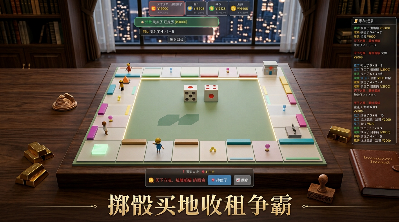 经典大富翁棋盘游戏3D版,支持掷骰子、买地、收租、股票投资等丰富玩法
