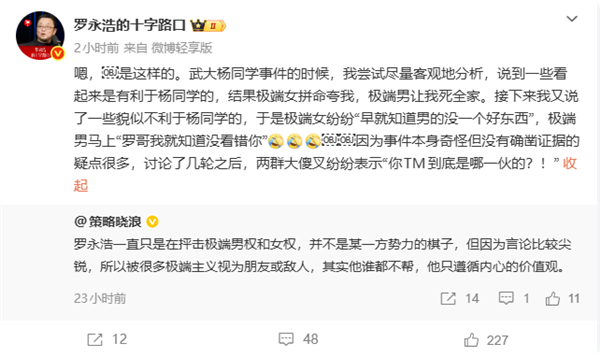 4月5日消息,罗永浩今天在社交平台谈及武大杨同学相关事件的评论经历,直言自己因客观分析事件的不同角度,先后被极端女权和极端男权群体态度反复转变对待,最终让两方极端势力都心生不满。