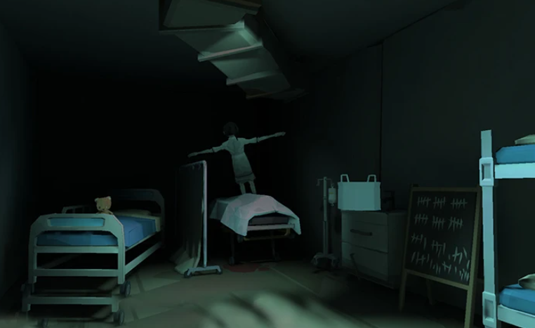 本作重构传统恐怖元素,将心理惊悚转化为具象化空间叙事。破败建筑内嵌多重异常现象:窗外巨型异瞳、墙体后规律敲击的巨手、形态未知的共生生物。玩法融合线索搜寻、物品收集与非线性对话交互,三者相互支撑,共同推进世界观揭示与角色动机理解。