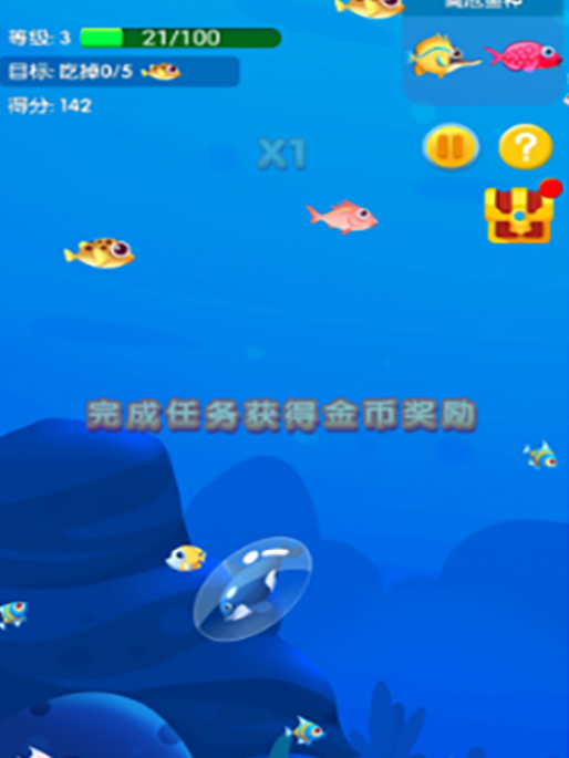 经典大鱼吃小鱼玩法的现代化演绎。玩家操控小虎鲸不断吞食体型更小的鱼类以扩大自身体积,同步规避大型掠食者。得分系统与成长体系深度绑定,累计分数可兑换金币,用于购置多样化水族箱及海底场景装饰,兼顾竞技性与收集养成乐趣。