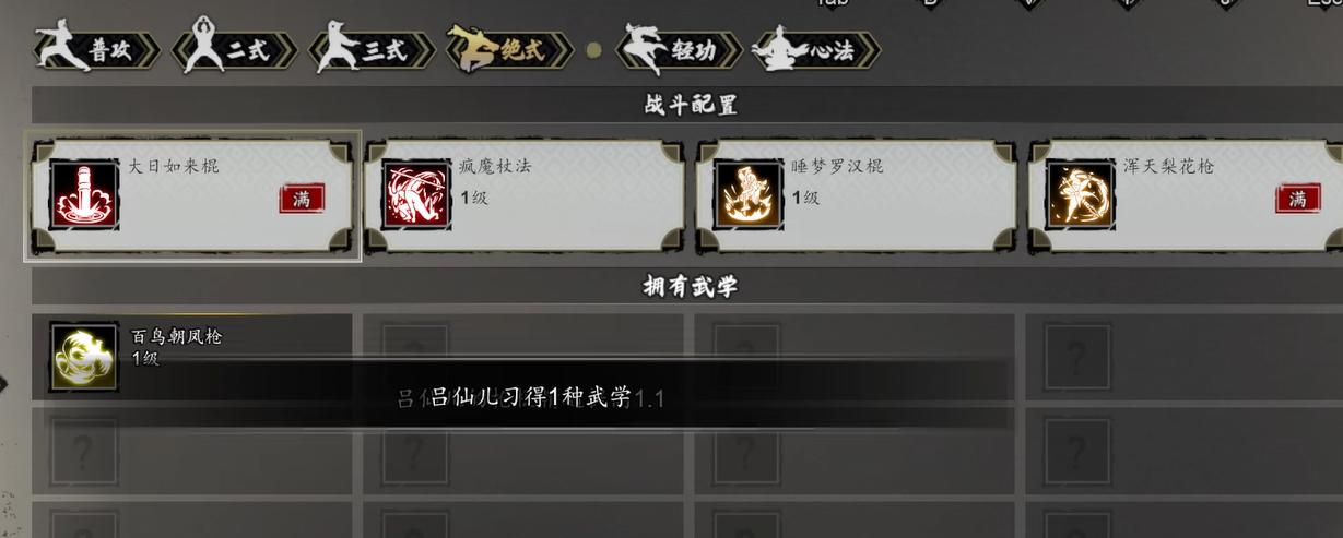 三门必需修满的武学中,【飞将戟法】已随留书同步获得;第二门为【百鸟朝凤枪】,但该武学在谭城阶段尚未开放学习,属正常设计节奏,并非遗漏步骤;第三门则为与吕仙儿角色绑定的特定配套武技(具体名称依游戏内实际显示为准)。其中【百鸟朝凤枪】需待甘泉苦水支线全部完成方可解锁——此为关键时间节点,务必确保该支线100%达成后再返回培养吕仙儿。
