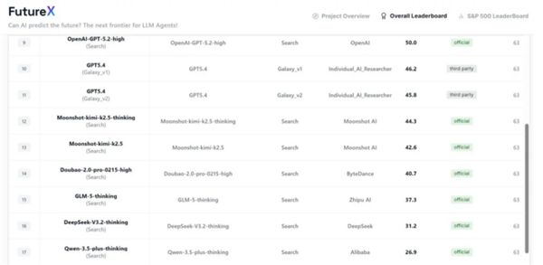 智谱的GLM-5-thinking则拿到37.3分,深度求索的DeepSeek-V3.2-thinking拿下31.2分。阿里的千问Qwen-3.5-plus-thinking则拿到26.9分,位列第17。
