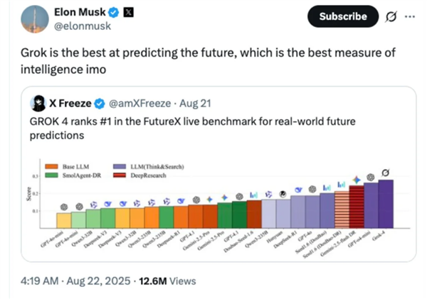 Grok-4以25.9分排在第18位。马斯克曾公开断言:“预测未来的能力,是对模型智能性最好的测试。”