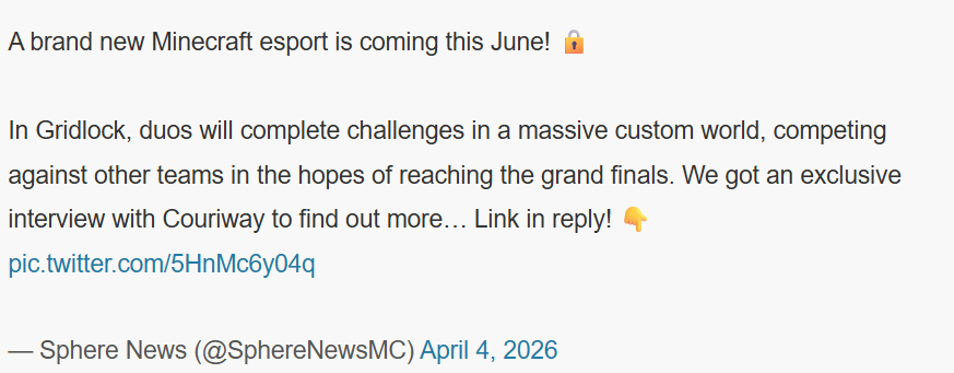 知名《我的世界》速通玩家Couriway日前宣布将联合所属战队Evil Geniuses共同举行电竞大赛“GRIDLOCK”,总赏金4.5万美元。
