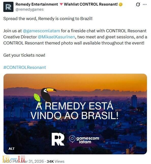 开发商Remedy Entertainment近日宣布,备受期待、屡获殊荣的游戏《控制》的续作《控制: 共振》将于今年在巴西南美洲游戏展览会(gamescom latam)上亮相。