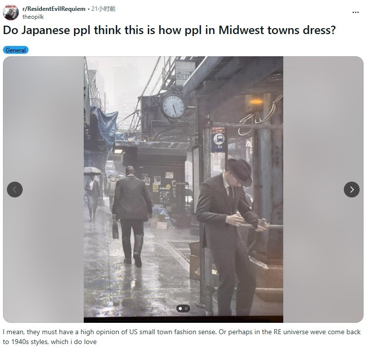 近日国外reddit论坛有网友发帖称,《生化危机9》美国小镇路人穿着复古,服饰风格回到了1940年代,而他很喜欢这种复古设计。