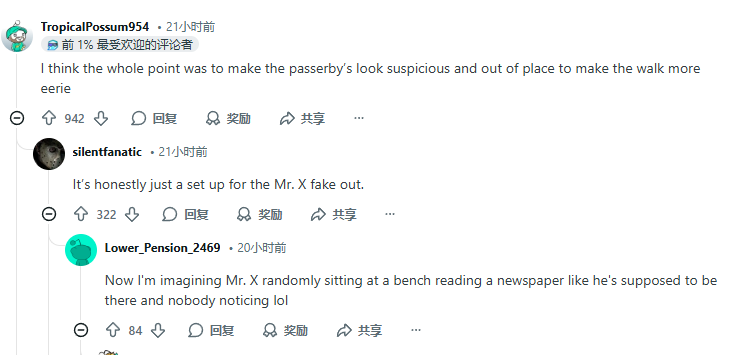 还有人认为:“这样的穿搭设计是故意为之。让路人穿着违和又怪异的服装,从而让整个场景显得更诡异。”“这种设计风格只是为游戏整体氛围增添特色而已。是为了形成鲜明反差,显得十分有趣。”