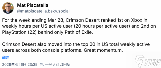 在截至3月28日(即游戏发布后的首个完整周)的数据中,美国地区的《红色沙漠》玩家在Xbox平台上的周平均游玩时长为20小时,而PlayStation平台更是达到了22小时。这一成绩使该作成功登顶Xbox美服玩家平均时长榜首;在PlayStation平台,其耐玩度也仅次于以硬核深度著称的《流放之路》(Path of Exile),位列全平台第二。