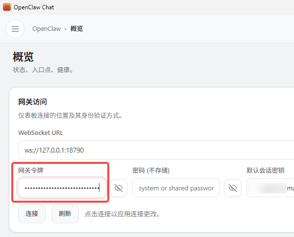 打开OpenClaw页面的“概览”功能,获取“网关令牌”。