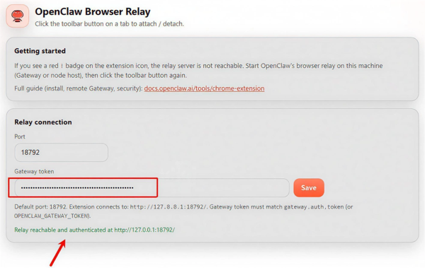 点击浏览器右上角的插件图标,进入配置页面,粘贴所获得的网关令牌并保存。