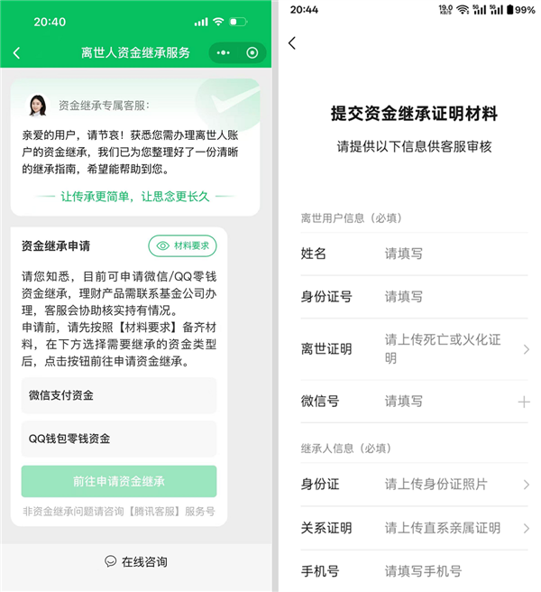 近日,腾讯客服宣布已升级逝者微信及 QQ 零钱资金继承专属服务。在材料完备的情况下,逝者零钱资金一般一到三个工作日、*快 24 小时可完成提取。