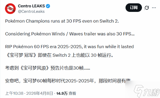 该博主在社交媒体上感叹道:“《宝可梦冠军》在 Switch 2 上也是 30 帧。考虑到之前《宝可梦:风/浪》的预告片也是 30 帧……看来宝可梦的60帧时代结束了,这真是令人遗憾。”