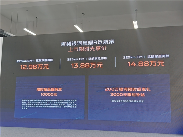 4月8日,吉利银河星耀8远航家系列在郑州正式上市。新车共推出三款纯电续航达225公里的新版型,限时先享价区间为12.58万至14.88万元。这一极具竞争力的价格,标志着其正式以高姿态入局中高级插混轿车市场。