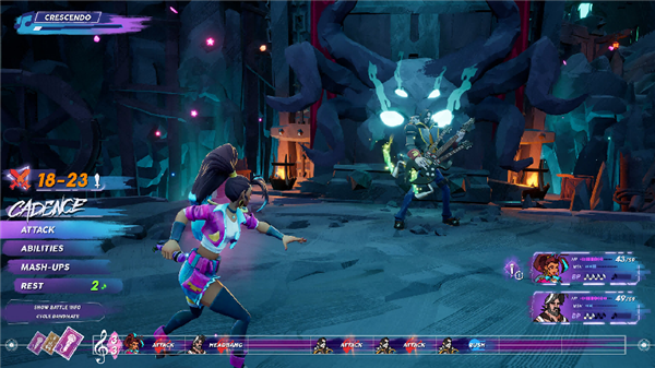 《卓越新声》最核心的亮点就是它那音乐与回合制融合的战斗设计。游戏的战场即是舞台,基础玩法借鉴了传统音乐游戏的音符敲击,但拥有“乐弦”“拨弦”“共振”等独特元素,玩家需要滑动屏幕模拟拨弦动作,配合多维轨道设计的音符完成节奏操作以发动攻击。每个行动回合被称为“乐段”,拍号上的数字决定了玩家方每个乐段的行动次数,其主要策略就是围绕“曲风混搭”展开:玩家招募的每位音乐人都有自己独特的曲风,如摇滚、电子、金属等,当乐段切换到对应曲风时,该队员的能力会大幅增强;而将不同曲风组合,便能触发强力的混搭合击,瞬间引爆全场。这种设计既有节奏操作的快感,也有策略搭配的乐趣。