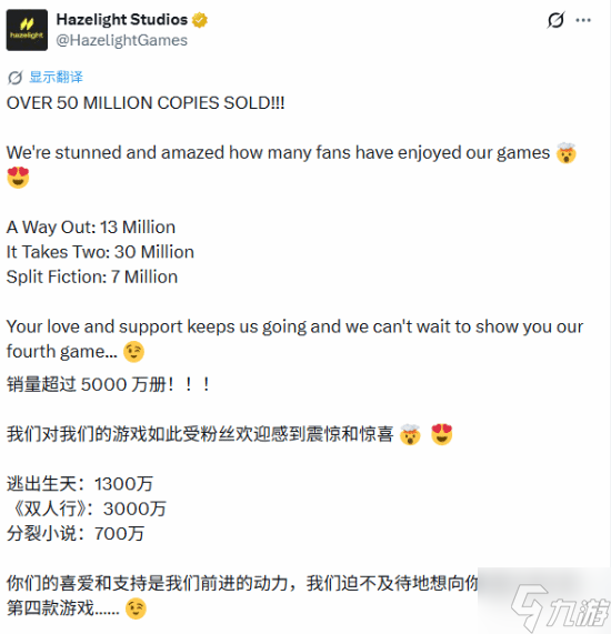 由知名制作人约瑟夫·法瑞斯领衔的这家工作室近日宣布,《逃出生天》《双人成行》和《双影奇境》三部作品的累计销量已经突破5000万份。官方也通过一段视频对这一里程碑进行了庆祝,并同步公布了各作品的具体表现。