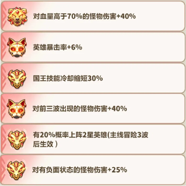 建议优先选择以主线关卡增伤词条为主的披风,品质可根据个人情况进行选择。如果没有的话,也可以选择毒系英雄增伤的披风,但值得注意的是,毒系增伤披风对国王没有增伤效果。