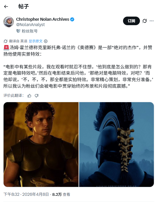 汤姆·霍兰德近日在接受GQ采访时,分享了与导演克里斯托弗·诺兰合作新片《奥德赛》的幕后体验。他透露,影片中某些场景的视觉效果令他感到震撼,一度以为是电脑特效。