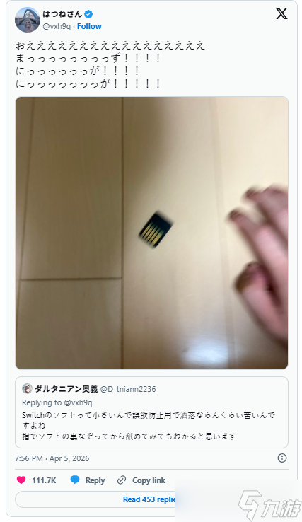 日本玩家@D_tniann2236分享称,父亲骗他说樱花的新芽很好吃,结果他吃下去后只感觉到苦,有种Switch卡带的味道。有网友看到后马上去尝试,并分享了一张自己倒在地上手撑地的搞笑图片,表示味道极其恶心。夸张的反应和文字迅速走红,吸引超过1200万次观看。