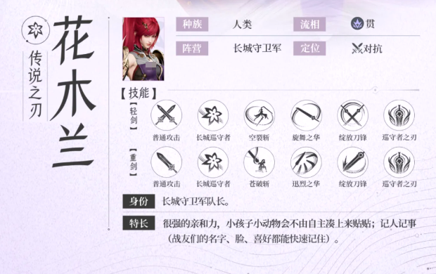 在花木兰的心目中,最为真挚的期盼,那就是迎来没有战事的那一天。他知道战争就会带来离别,还有伤痛,老百姓们渴望安宁,所以他才会手握着利刃,不是为了征战,而是为了能够停止战斗。作为游戏中登场的英雄,花木兰就会拥有飒爽的外形,更是承担着一份精神。在沙场上,他就是长城之上不绝的余音,也是大家心目中正义的象征。不过目前为止对于花木兰介绍并不是很多,大家可以继续的关注游戏。