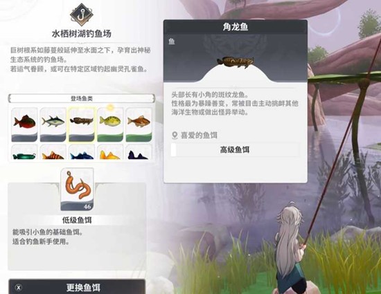 角龙鱼栖息在森林地带,有两个地方可以钓到:森林关卡的普通钓鱼场,以及水栖树湖的专属钓鱼场。前者到达方便,适合快速尝试;后者环境更安静,可以垂钓更长时间。这种鱼额头有角,上钩后挣扎非常剧烈。推荐使用“韧藤钓线”和“镇定浮标”的组合,并在钓鱼前使用“抗惊扰药剂”,来降低脱钩的风险。无论选择哪个钓点,都需要确保角色的“自然亲和”属性达到65点以上。