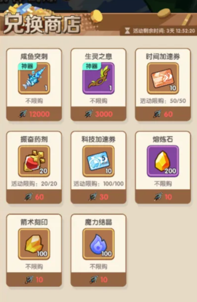 随着玩家命中目标越来越准,得到的神镞道具奖励也就越发丰厚。这些神镞就是本次活动的主要货币。试炼结束后,殿下们就可以用积累下来的神镞道具去活动商店购买自己想要的奖励了。本期活动的重头戏有新神器【咸鱼突刺】【生灵之息】等奖励。这些神器一般都有特殊的效果,可以大幅度提高玩家以后的战斗力,所以是必换的武器。