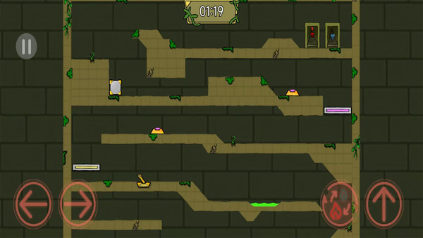 角色设定严格区分属性:红色火丸耐高温、可穿越火焰区域;蓝色水丸抗低温、适配冰面环境。通关条件明确——火丸须进入红色门,水丸须进入蓝色门,路径选择受颜色规则约束。关卡内宝石与钻石按色系分布,仅对应角色可采集。单人模式下支持即时切换控制权,考验玩家对双角色特性与地形机制的理解深度。