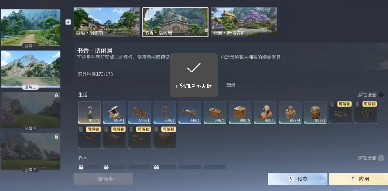 家园建设采用渐进式解锁机制。初始阶段仅开放基础建筑位,随主线进度与任务完成,木材采集点、石料采集点、炼丹房、食物制作台等关键功能区域将陆续激活。所有建筑均支持模板化部署,内置多套预设方案,一键应用即可完成结构搭建,大幅降低新手门槛,让玩家快速聚焦于策略规划与风格表达。