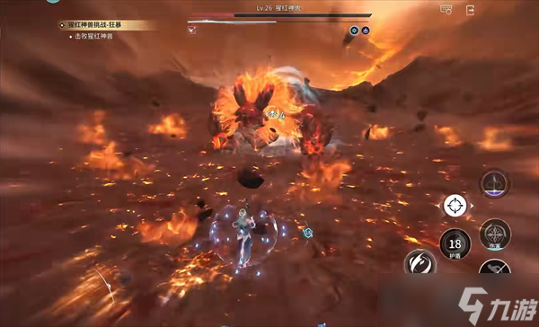 猩红神兽通体燃烧烈焰,战斗分为两大阶段,并在关键血量触发特殊机制,全程需严格分工与躲避技能。
