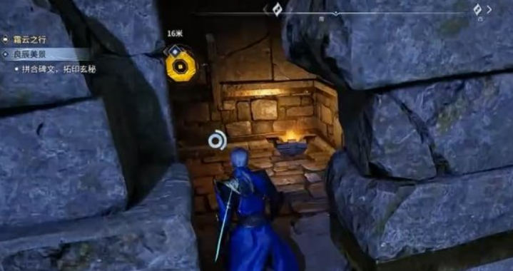 石碑共需拼合三块碎片,分别藏于不同位置:第一块位于左侧建筑外壁的隐蔽洞穴内,洞口设有一枚标靶装置,击破后洞门开启;第二块置于前方铁栅栏后方,需将场景中的蓝色石块牵引至指定压力板上,待机关响应、栅栏升起后方可进入;第三块则直接置于高台顶端,沿路径登顶即可拾取。集齐三枚碎片后返回青铜石碑处完成安装与拓印操作,待NPC前来查验并完成二次对话。