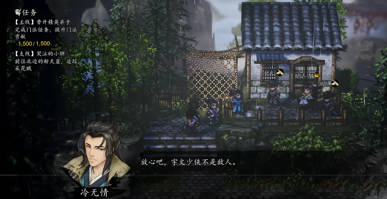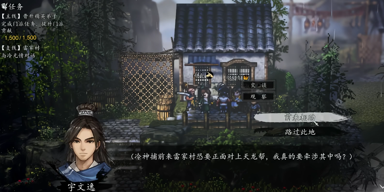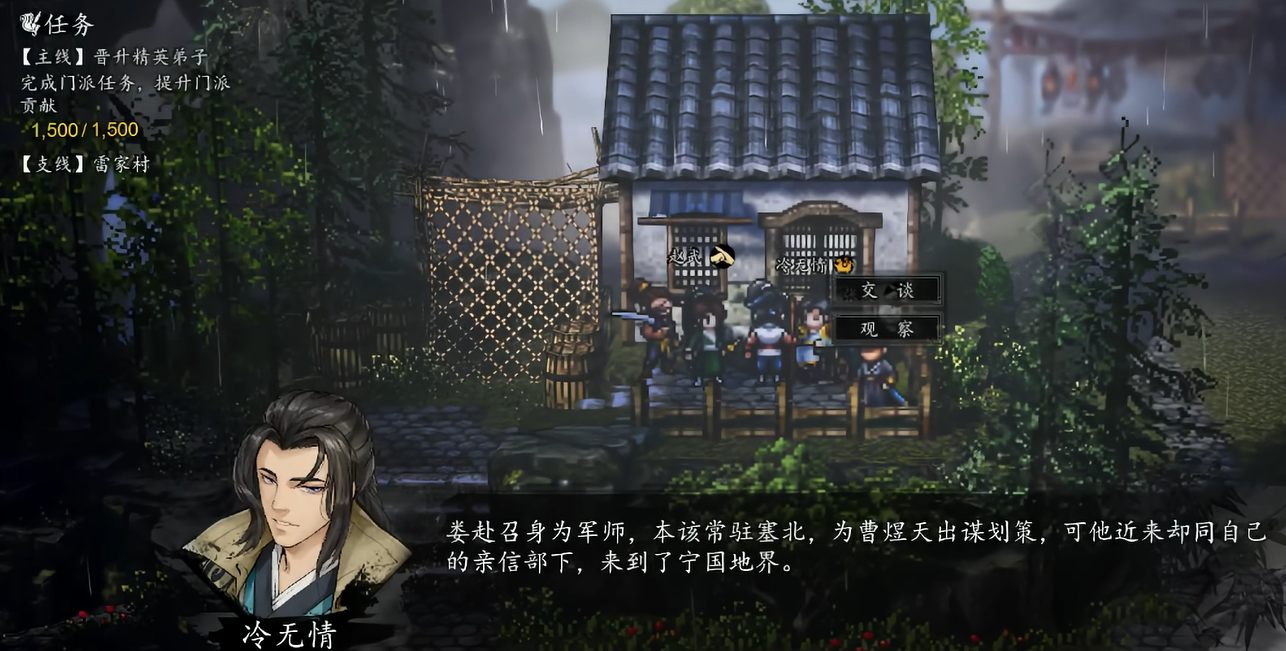 接着就可以往雷家村走了。刚走进去靠近冷无情的时候。会自动播放一段剧情。看完接着去和他讲话。选择前来帮忙的那个选项。然后去找旁边的张文和赵武。跟他们聊聊能知道更多的背景情况。这时候先不忙着出去。要在村子里到处转转。和所有的村民都讲一次话。尽量一个人都不要漏掉。讲完之后再回去找冷无情报告。任务就会更新提示要去连鼓山。这时候冷无情会暂时加进队伍里。趁着他进队了。如果之前没找张文和赵武切磋过。记得现在找他们切磋一下拿点有用的物件。