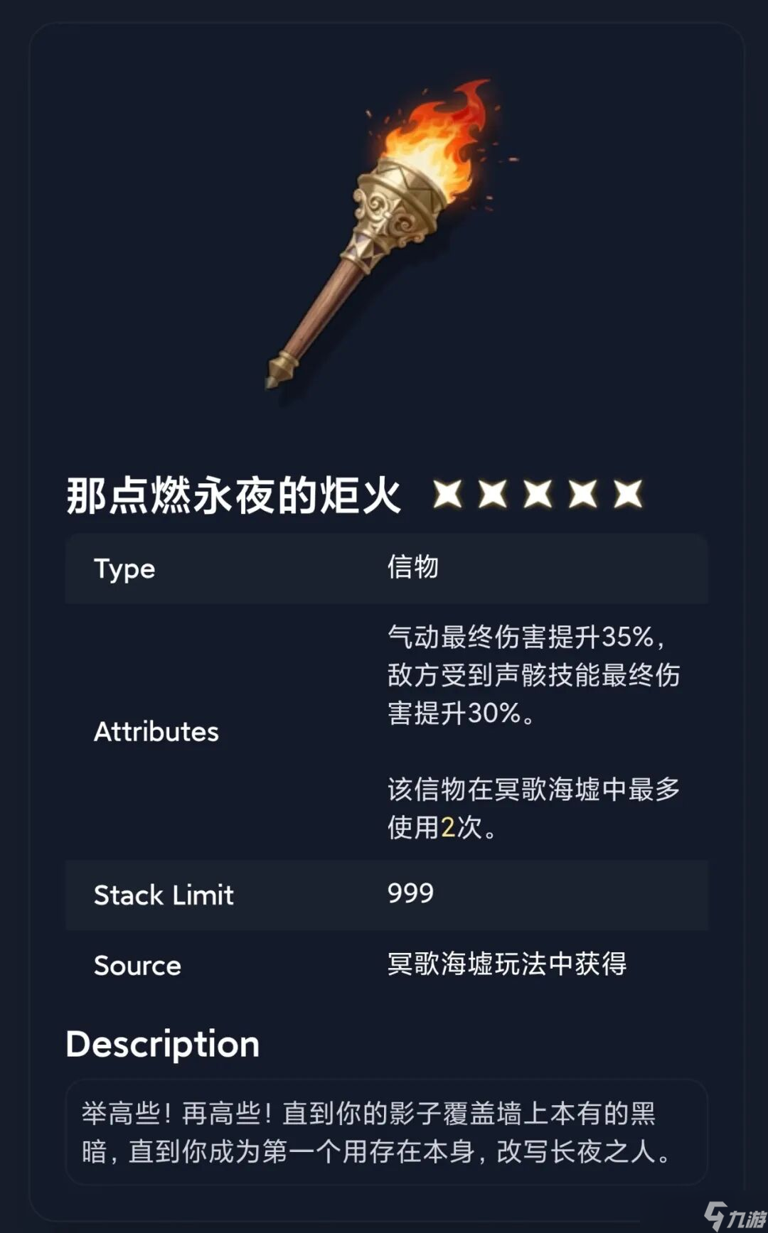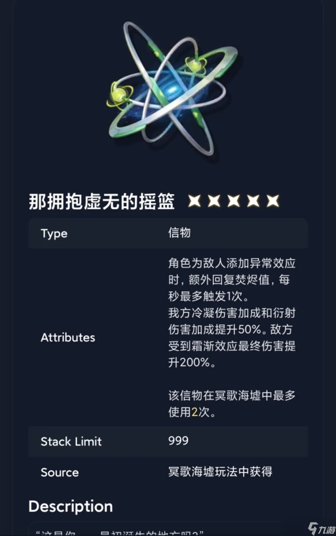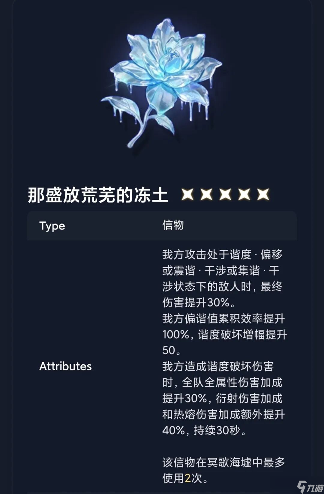 角色为敌人添加异常效应时,额外回复焚烬值,每秒最多触发 1 次。我方冷凝伤害加成和衍射伤害加成提升 50%。敌方受到霜渐效应最终伤害提升 200%。