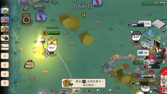 玩家在白天通过采集资源、吃掉武器来获取并升级特性,投入矿石升级基地,为夜晚的防守战做好充足准备。夜幕降临后,则要使出十八般武艺来应对敌人,无论是远战、近战、踢击或是打碎道具,你甚至可以举起并挥舞队友来应对攻击!