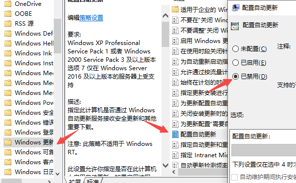 找到并双击 “配置自动更新”,选择 “已禁用” → 确定。