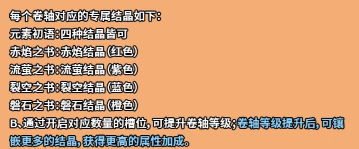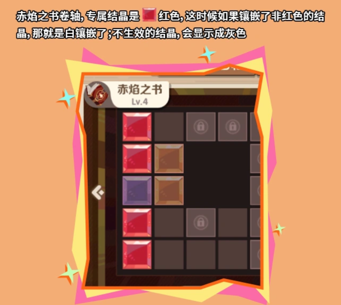 魔法卷轴系统内设四类基础属性结晶,严格对应颜色与功能:赤焰结晶(红色)、磐石结晶(橙色)、裂空结晶(蓝色)、流萤结晶(紫色)。每种结晶仅适配特定颜色标识的卷轴——例如赤焰之书仅接受赤焰结晶,若误镶其他色系,不仅属性无效,图标还将置灰,导致材料浪费。该系统采用4阶结构设计,即红、橙、蓝、紫四色结晶数量总和决定当前卷轴所处阶数。操作方式为长按结晶图标使其放大,再拖入卷轴对应空白镶嵌位完成装配。