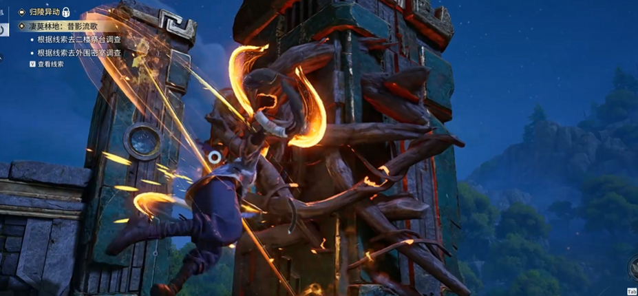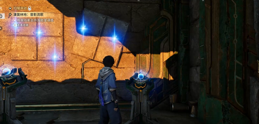 第一枚钥匙碎片位于二层平台区域。此处需激活黄色机关,使光束经镜面反射。但镜面被藤蔓遮挡,必须使用火属性技能或携带火元流角色将其焚毁。清除障碍后再次启动机关,左侧将浮现黄色踏板;此时需牵引附近石块压住该踏板以维持机关运行。右侧同理,亦需牵引石块压制对应踏板。最后登顶至最高层,用火系能力烧除顶层藤蔓,激活顶部黄色机关完成解密,返回平台即可拾取首枚钥匙碎片。