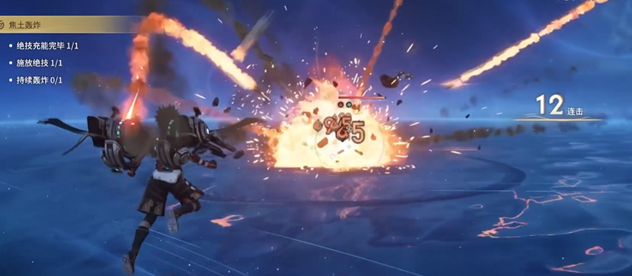 大招【狂热轰击】为指向型范围技能,向前方扇形区域投射大量飞弹,造成高额AOE伤害。实战中需注意:榴弹炮每发命中所积累的兴奋值远高于普攻,因此建议在榴弹储量回满后优先使用三技能快速叠满兴奋值,从而更高效地进入解限状态,最大化整体输出循环效率。
