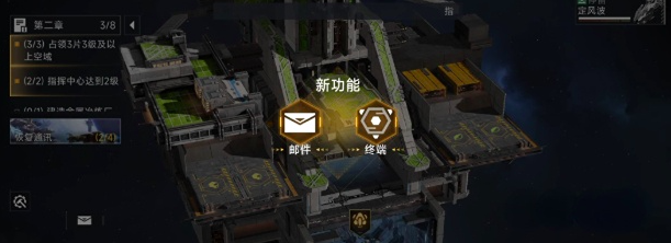 当玩家们的个人等级提升到10级时,就会自动解锁“终端”这一板块,玩家能够直接在游戏界面上看到两个新功能,一个是邮件,一个是终端,就如小编下图所展示的一般。玩家在点击终端后就能够搜索出各种新的玩法项目,如果未成功解锁这一玩法内容标志或处于灰色状态。