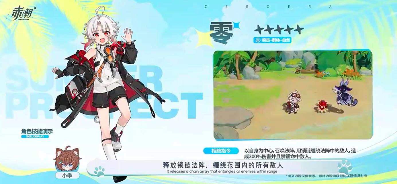 先来说一下零这个角色,他的星级评定为SSS五星,零的技能可不仅仅是好看,他的小技能侵蚀指令可以让零实现对目标进行三段锁链打击,同时最后一击时会附加有侵蚀效果,如果玩家们能够搭配得当,伤害会产生质的变化,接下来零的大招——“拒绝指令”,这是一个场控技能,制释放锁连法阵缠绕范围内的所有敌,造成伤害的同时也能附加禁锢效果。