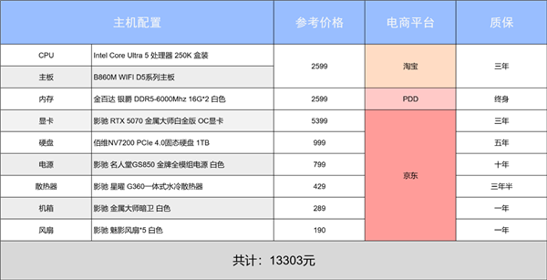 那这套配置依旧是有调整空间的,对于预算充足的用户可以向上考虑Ultra 270K+RTX 5070Ti的组合,卡住预算脖子的还是内存溢价,觉得太贵可以退而求其次选择D5 8G*2的内存套条,先组双通道减少性能损失,还能省下约800左右的预算。