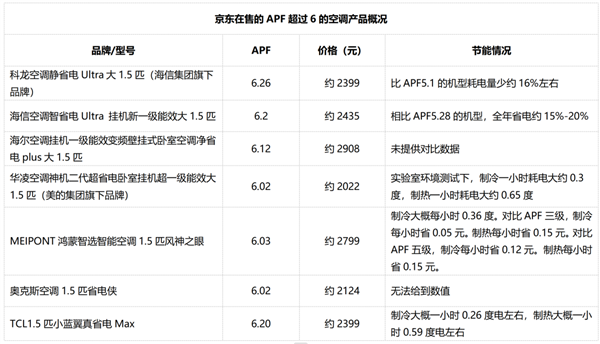 京东在售的APF超过6的部分空调产品