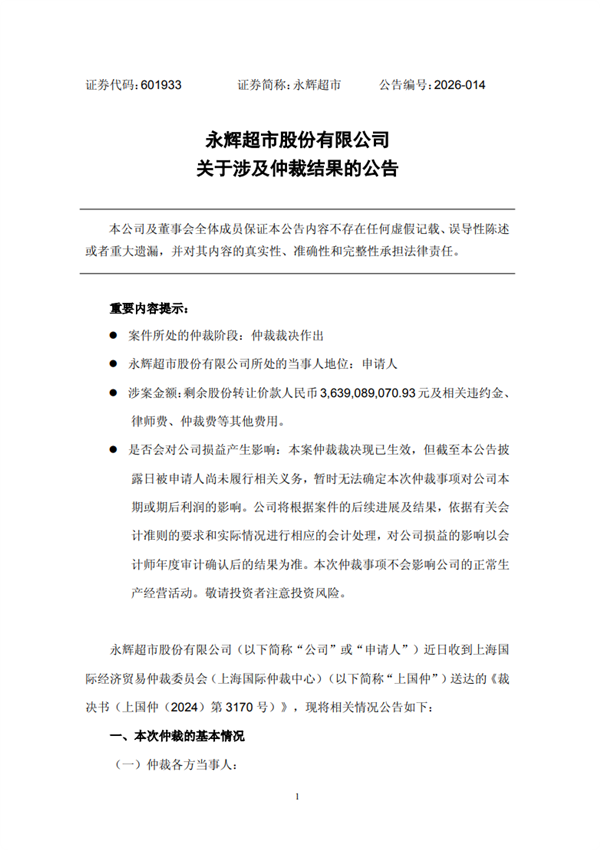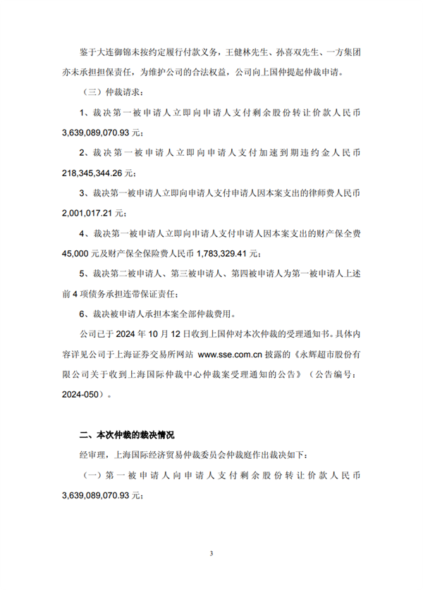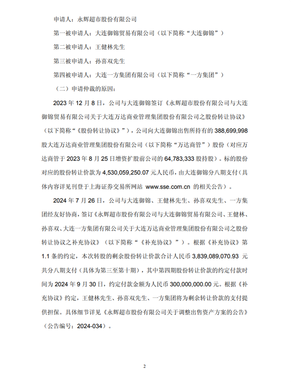 事情起因是永辉此前出售万达商管股份,交易总价45.3亿元,约定分期支付。受让方大连御锦从第二期就开始逾期,后续虽重新约定付款计划并追加担保,但依旧没有按时履约,永辉只能提起仲裁维护自身权益。