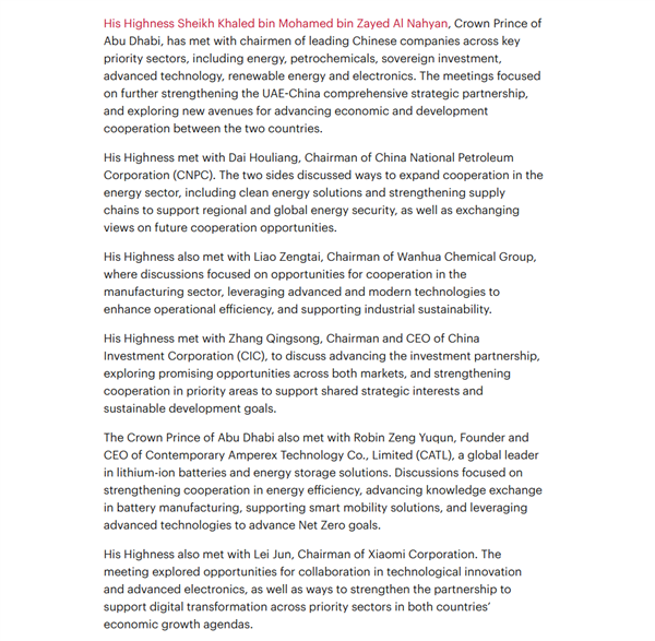 据阿布扎比媒体办公室消息,访华期间,哈立德在北京会见了来自能源、石化、先进技术、可再生能源及电子等关键领域的领军企业董事长。
