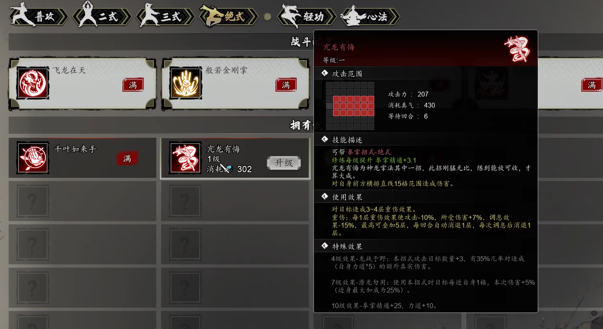 初始习得时,「亢龙有悔」基础属性为:攻击力204点,真气消耗430点,冷却时间6回合。攻击判定范围为身前横向直线15格,覆盖面积优异。命中目标后,附加3–4层「重伤」状态,每层使目标攻击力降低10%,所受伤害提高7%,调息效率下降15%。重伤最多叠加至5层,每回合自然消减1层,需结合出手节奏维持压制连续性。