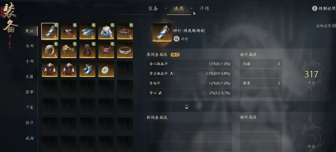 黑夜珊瑚靴原先的词条是会心抵抗力,还有重击抵抗力。这一双鞋子的属性很明显,就是以防御性为主,适合奶妈或者坦克类的职业。在在洗练的过程中就应该注重于会心抵抗、重击抵抗、整韧率这三个方面。当然如果是输出职业,那也可以适当性的调整一下。额外属性中也应该结合起来分析,如果是法系职业就可以选择留下来。