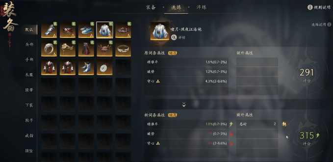 黑夜江海袍这件衣服,原词条精准率、破势、会心,毫无疑问,这就是一个妥妥的输出神装。而这件衣服主要的输出词条就在于三个方面,其中最为关键的就是精准率。大家在洗练的过程中就应该注重于精准率,必须要洗到接近上限为止。在额外的属性中,忍耐是比较重要的,适合于半肉输出,还有纯输出职业,可以把伤害度直接拉满。