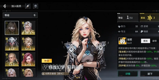 莉莉安娜就是一个比较罕见的舰长。他都可以给足超模buff,没有存在任何的限制,这在游戏中也是比较独特的。其他的人只能够绑定单一的船舰,可是他不会这样,不管你玩什么样的阵容,全部都可以无缝的融入,所以实用性相对比较出色。如果开局你能够拿到它就可以节省一大半的培养成本,后期根本就不需要去纠结阵容的搭配,直接闭眼练即可,完全不会吃亏。